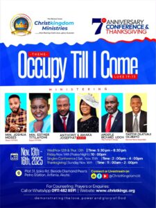 Join Christkingdom Ministries for the 7th Anniversary Conference & Thanksgiving themed “Occupy Till I Come” (Luke 19:13) — a powerful four-day encounter filled with worship, the Word, and divine empowerment.